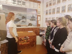 Посетили музей боевой славы, организованный на базе школы. Ребята познакомились с экспонатами музея, фотоматериалами об участниках войны и тружениках тыла, об основных битвах Великой Отечественной войны.